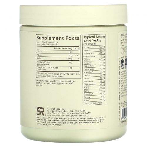 Описание товара Sports Research, Collagen Peptides, Hydrolyzed Type I & III, Matcha Green Tea, 10.16 oz (288 g)
