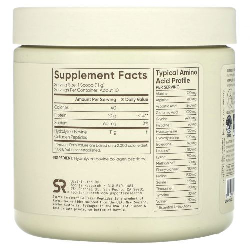 Описание товара Sports Research, Пептиды коллагена, гидролизованный коллаген типа I и III, без вкусовых добавок, 110,7 г (3,9 унции)