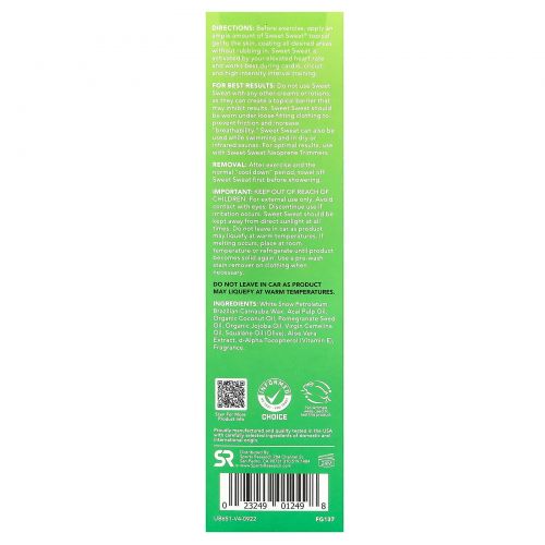 Sweet Sweat® — это гель для местного применения, который способствует обильному и быстрому потоотделению во время тренировок, чтобы вы могли снизить вес лишней воды и получить максимальную пользу от каждой капли. Sweet Sweat лучше всего подходит для сердечно-сосудистой системы, круговых тренировок, высокоинтенсивных тренировок и сауны. Сочетание прохладных мятных и цитрусовых дарит вам свежесть во время и после тренировки.