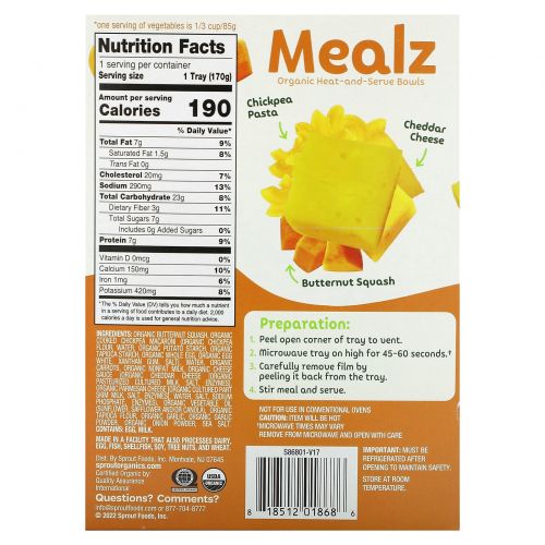 Sprout Organics, Mealz, органические разогреватели в мисках, макароны и сыр из нута, 170 г (6 унций)