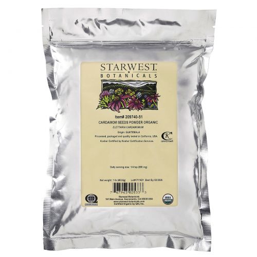 Описание товара Starwest Botanicals, Порошок из семян органического кардамона, 453,6 г (1 фунт)