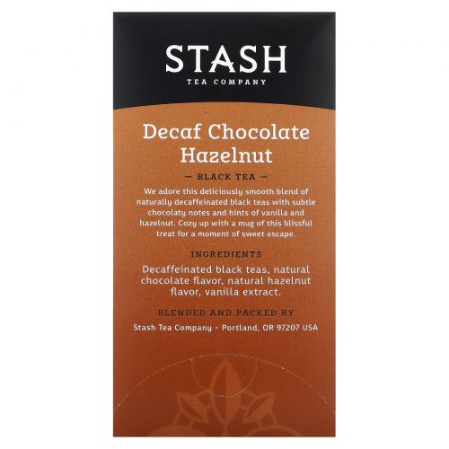 Описание товара Stash Tea, Чай высшего сорта без кофеина, шоколад и лесной орех, 18 чайных пакетиков, 1,2 унции (36 г)