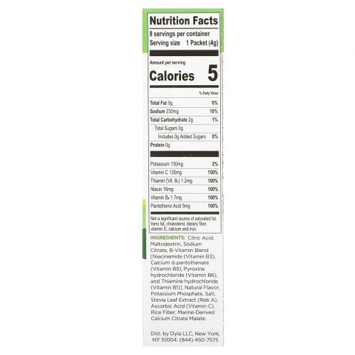 Лимонная кислота, мальтодекстрин, цитрат натрия, Смесь витаминов группы B [ниацинамид (витамин B3), d-пантотенат кальция (витамин B5), пироксина гидрохлорид (витамин B6), и гидрохлорид тиамина (витамин B1)], натуральный ароматизатор, фосфат калия, соль, экстракт листьев стевии (реб А), аскорбиновая кислота (витамин C), рисовое волокно, цитрат кальция малат морского происхождения.