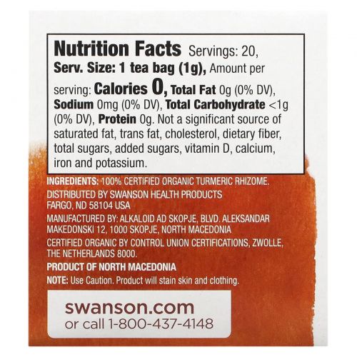 Описание товара Swanson, 100% органический чай с куркумой, без кофеина, 20 чайных пакетиков, 20 г (0,7 унции)