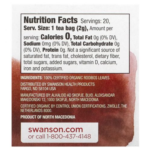 Описание товара Swanson, 100% органический красный чай ройбуш, без кофеина, 20 чайных пакетиков, 40 г (1,4 унции)