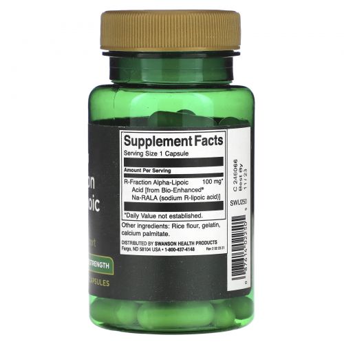 Описание товара Swanson, Альфа-липоевая кислота R-фракции, двойная сила действия, 100 мг, 60 капсул