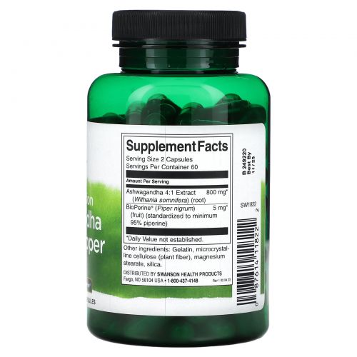 Описание товара Swanson, Ашваганда и черный перец с высокой усвояемостью, 120 капсул