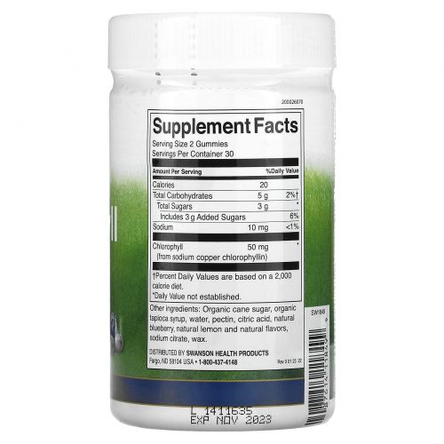 Описание товара Swanson, Детокс-жевательные таблетки с хлорофиллом, голубика, 25 мг, 60 жевательных таблеток