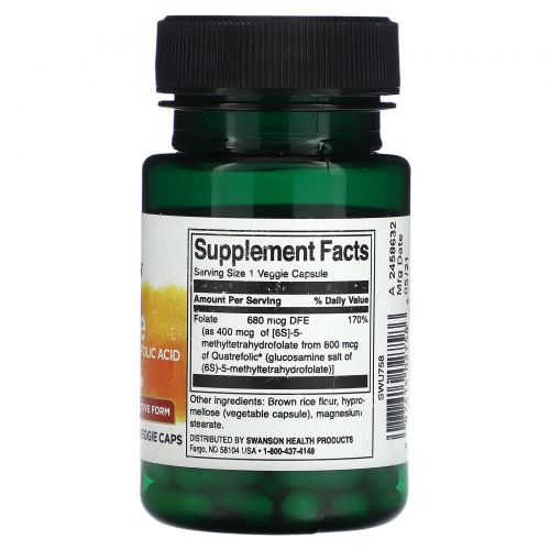 Описание товара Swanson, Фолат 5-метилтетрагидрофолиевая кислота, 400 мкг, 30 растительных капсул