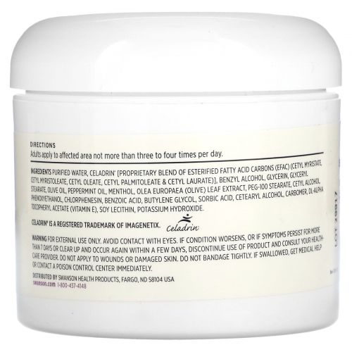 Укрепите суставы с помощью крема для суставов Swanson с целадрином. Этот крем для местного применения содержит этерифицированные углеродные кислоты жирных кислот (EFAC), включая цетилмиристат, цетилмиристолеат и другие, и действует уникальным образом.