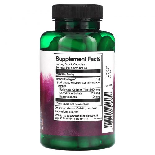 Коллаген Swanson из куриной грудки поддерживает здоровое старение, способствуя повышению эластичности кожи и уменьшению морщин при длительном применении. Он также способствует облегчению движений, питая соединительную ткань для сильных и гибких суставов. Каждая порция содержит гидролизованный коллаген типа II, хондроитинсульфат и гиалуроновую кислоту из BioCell Collagen. Хондроитинсульфат является важным структурным компонентом хряща, а гиалуроновая кислота, как известно, способствует удержанию влаги для здоровья суставов и кожи.