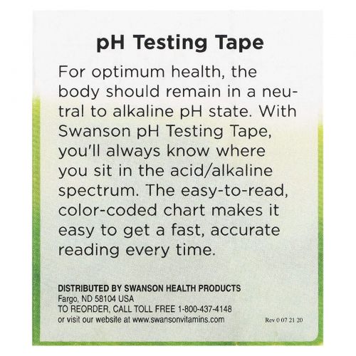 Описание товара Swanson, Лента для проверки pH с дозатором, прибл. 15 футов