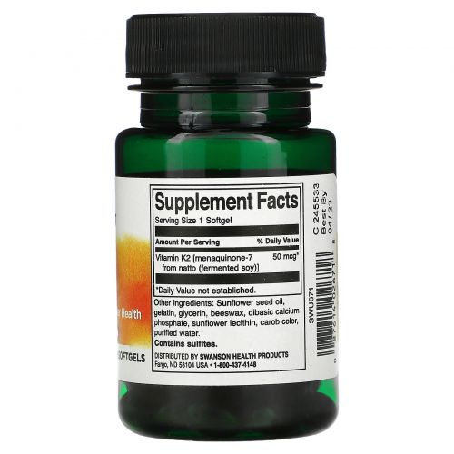 Описание товара Swanson, Natural Vitamin K2, Bone and Cardiovascular, 50 mcg, 30 Softgels