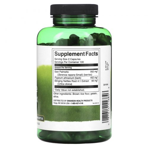 Описание товара Swanson, Травяной комплекс для простаты с серой, пигеумом и крапивой двудомной, 200 капсул