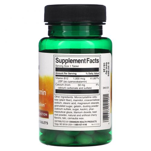 Описание товара Swanson, Витамин B12, цианокобаламин, тройного действия, 1000 мкг, 90 таблеток