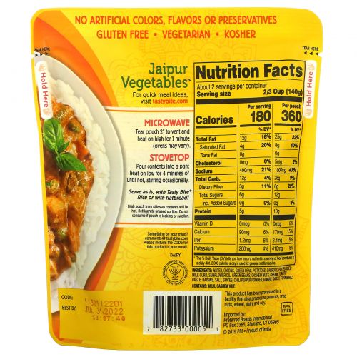 Описание товара Tasty Bite, индийские овощи, по-джайпурски, средняя острота, 285 г (10 унций)