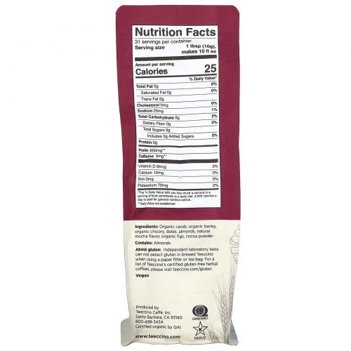 Описание товара Teeccino, Мокко, кофе средней обжарки, без кофеина, 312 г