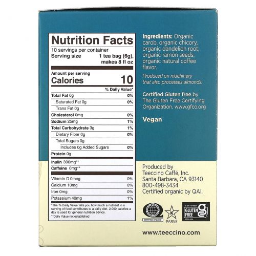 Описание товара Teeccino, Органический травяной кофе, одуванчик глубокой обжарки, без кофеина, 10 Т-пакетиков, 2,12 унции (60 г)