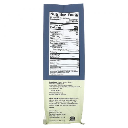О глютене. При независимом лабораторном тестировании глютен не обнаруживается в Teeccino, заваренном с использованием бумажного фильтра или чайного пакетика.