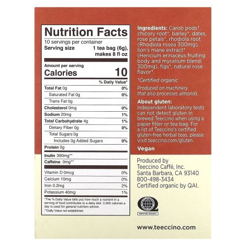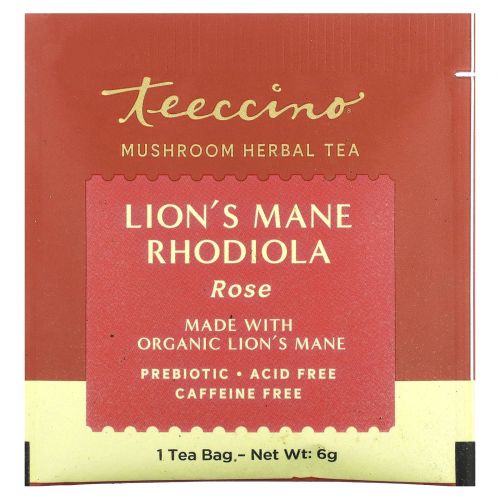 Описание товара Teeccino, Травяной чай с грибами, львиная грива и родиола, роза, без кофеина, 10 чайных пакетиков, 60 г (2,12 унции)