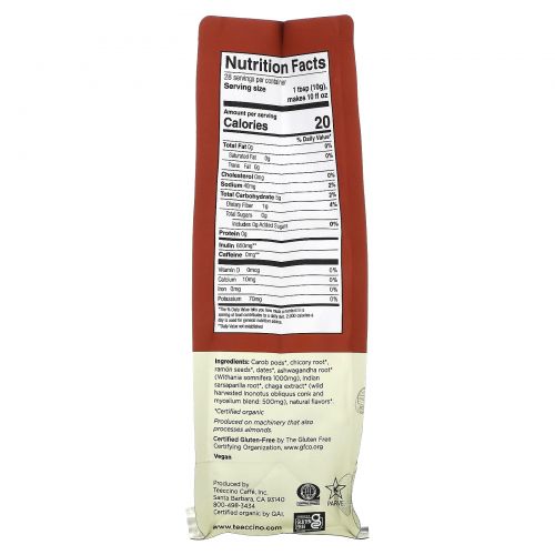 Описание товара Teeccino, Травяной кофе с грибами, средней обжарки, чага ашваганда, без кофеина, 284 г (10 унций)