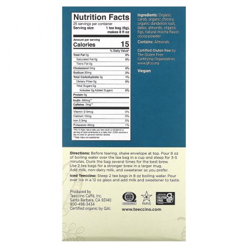 Описание товара Teeccino, Жареный травяной чай, мокко из одуванчика, без кофеина, 25 чайных пакетиков, 150 г (5,3 унции)