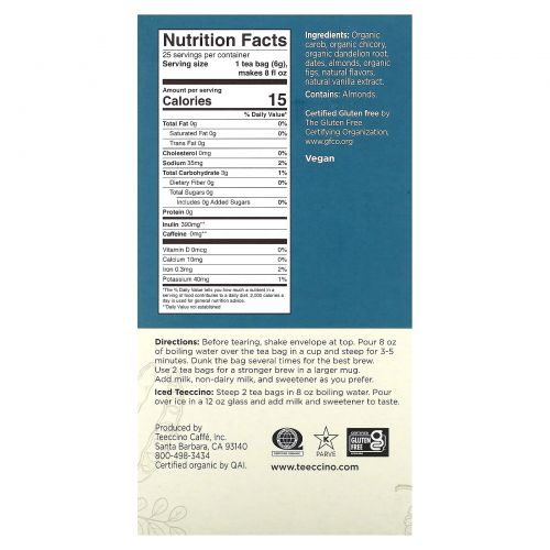 Описание товара Teeccino, Жареный травяной чай, одуванчик, ваниль, орехи, без кофеина, 25 чайных пакетиков, 150 г (5,3 унции)