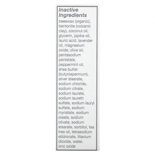 | Вспомогательные ингредиенты : пчелиный воск (органический), бентонит (вулканическая глина), кокосовое масло, глицерин, масло жожоба, лауриновая кислота, лавандовое масло, оксид магния, оливковое масло, пентетат натрия, мятное масло, масло ши (Butyrospermum), стеарат серебра, хлорид натрия , цитрат натрия, лаурат натрия, лауретсульфат натрия, лаурилсульфат натрия, миристат натрия, олеат натрия, оливат натрия, стеарат натрия, сорбитол, масло чайного дерева, этидронат тетранатрия, диоксид титана, вода, оксид цинка. | |