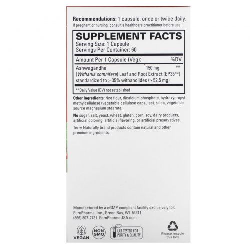 Описание товара Terry Naturally, Ashwagandha EP35 Extra Strength, 60 капсул