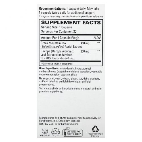 Описание товара Terry Naturally, Греческий горный чай + бакопа, 30 капсул