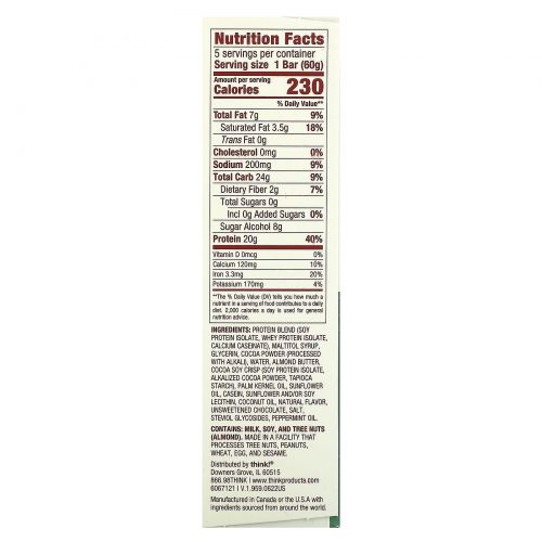 Описание товара Think !, Батончики с высоким содержанием протеина, шоколад и мята, 5 батончиков по 60 г (2,1 унции)