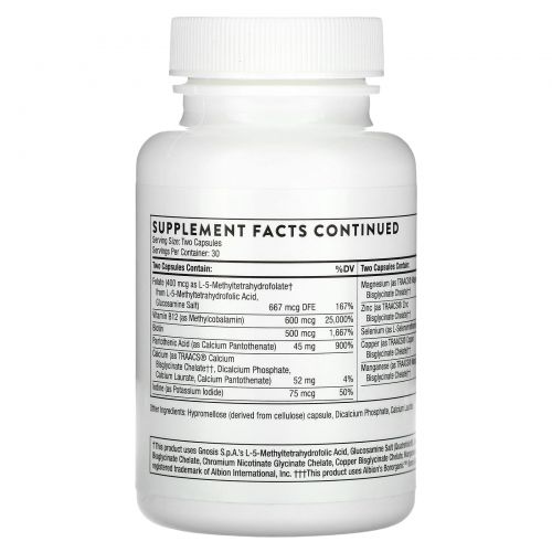 | Фолат (400 мкг в виде L-5-метилтетрагидрофолата† из L-5-метилтетрагидрофолиевой кислоты, глюкозаминовой соли) | 667 мкг пищевого фолатного эквивалента | 167% |