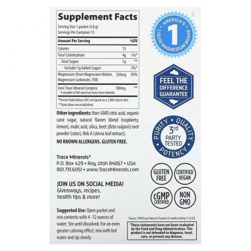 Описание товара Trace Minerals Research, Mag Pak To Go, Magnesium Powder, Citrus Raspberry Flavor, 350 mg, 15 Packets, 0.17 oz (4.8 g) Each