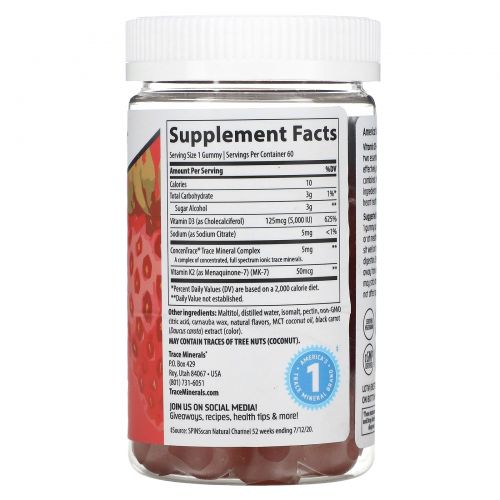 Описание товара Trace Minerals ®, Жевательные мармеладки с витамином D3 и K2, с клубникой, 60 жевательных таблеток