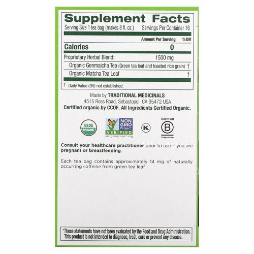 Описание товара Traditional Medicinals, Органический зеленый чай с обжаренным рисом, матча, 16 чайных пакетиков в упаковке, по 1,5 г (0,5 унции)
