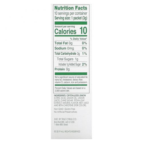 Описание товара True Citrus, True Lemon, лимонад, персик, 10 пакетиков по 3 г (0,11 унции)