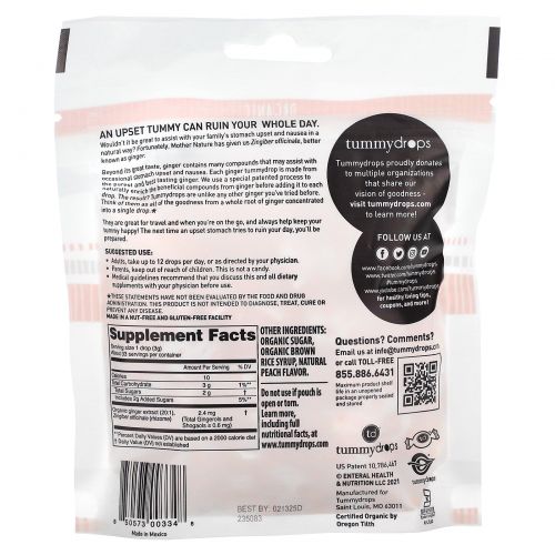 Описание товара Tummydrops, Organic, двойной имбирь и персик, 33 пастилки, 105 г (3,7 унции)
