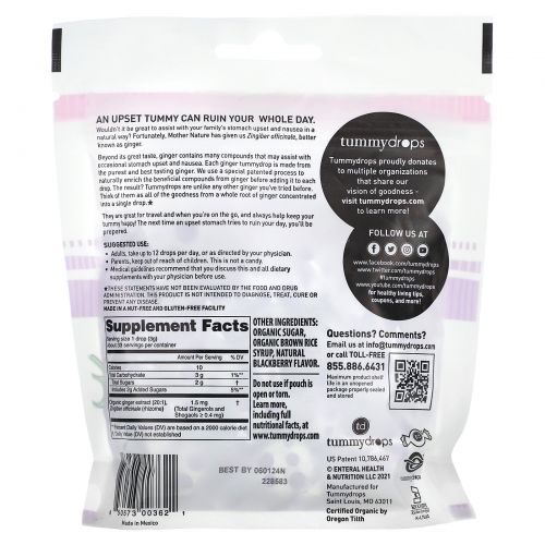 Описание товара Tummydrops, Органический сладкий ежевика и имбирь, 33 пастилки, 105 г (3,7 унции)