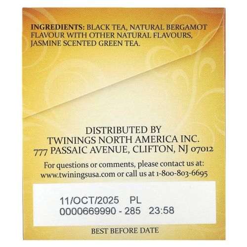 ПредупрежденияBlack tea, natural bergamot flavours with other natural flavours, Jasmine scented tea.
