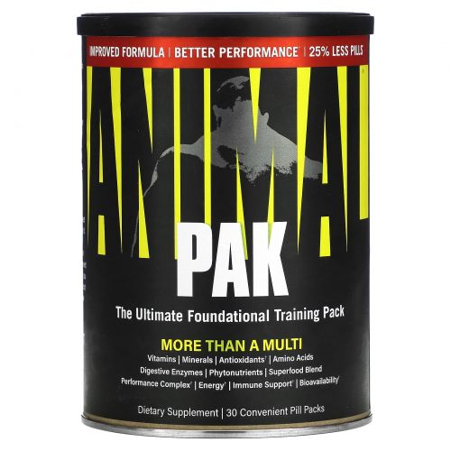 Animal Pak уже несколько десятилетий является лучшим выбором для преданных своему делу бодибилдеров, профессиональных спортсменов и любителей тренировок. Это проверенный комплексный базовый комплекс для тренировок с более чем 60 мощными питательными веществами, который поможет достичь оптимальных результатов для тела и фитнеса.