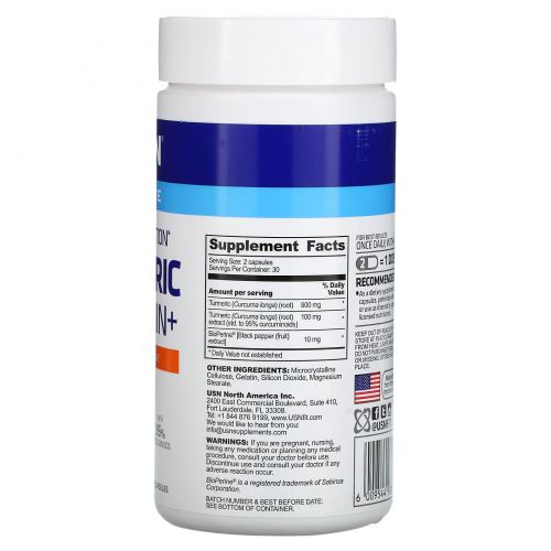 Описание товара USN, легкоусвояемый куркумин с комплексом BioPerine, 500 мг, 60 капсул