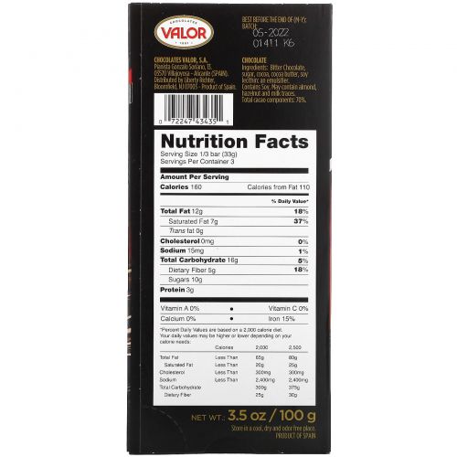 Описание товара Valor, Intense Dark Chocolate, 70% Cacao, 3.5 oz (100 g)