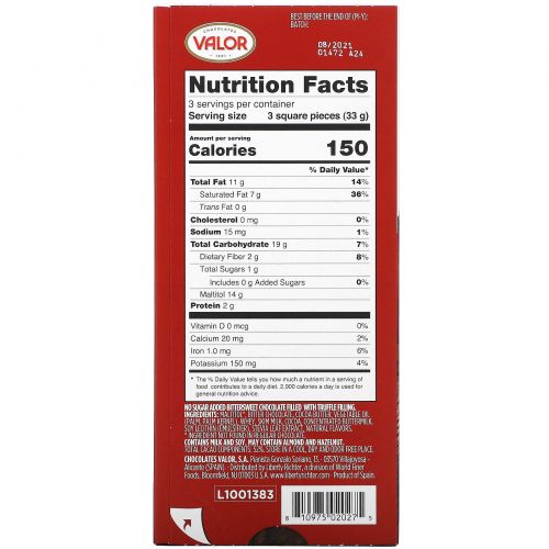 Описание товара Valor, Сливочный темный шоколад со сливочной трюфельной начинкой, 0% сахара, 100 г (3,5 унции)