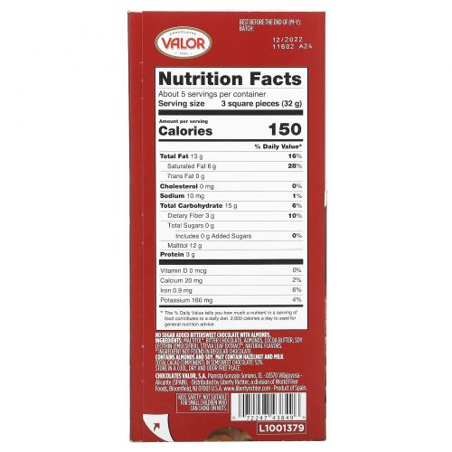 Описание товара Valor, Темный шоколад с миндалем, 52% какао, без добавления сахара, 150 г (5,3 унции)