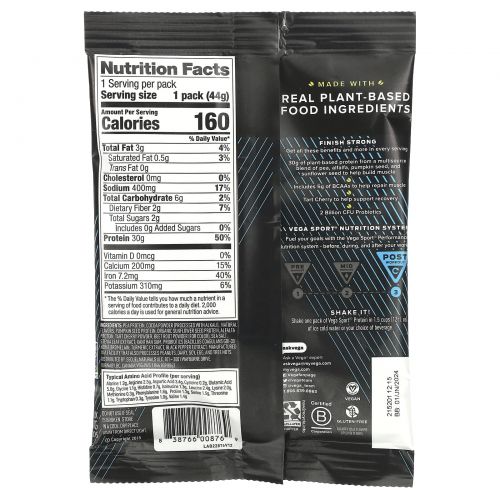 Описание товара Vega, Спорт, Эффективная питьевая протеиновая смесь, шоколадный вкус, 1,6 унций (44 г)