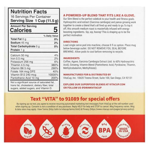 Описание товара VitaCup, Slim Coffee, средней обжарки, 16 чашек по 11,5 г (0,41 унции)