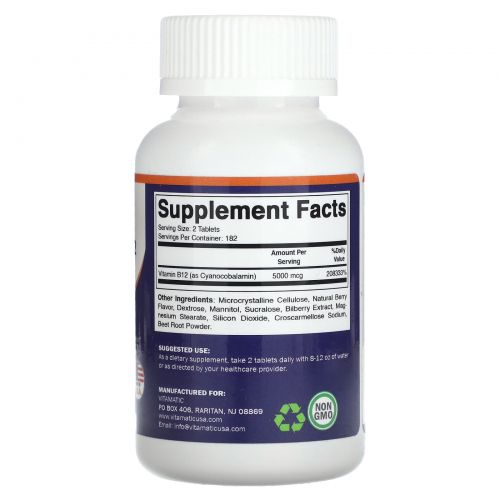 Описание товара Vitamatic, Витамин B12, натуральные ягоды, 2500 мкг, 365 быстрорастворимых таблеток