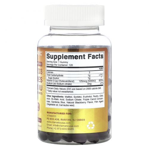 Vitamatic, Жевательные мармеладки с витамином D3 без сахара, натуральная ежевика, 5000 МЕ (125 мкг), 120 жевательных таблеток