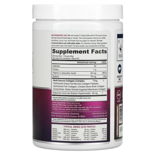 Описание товара Vitauthority, Multi Collagen Protein Plus Vitamin C, гиалуроновая кислота, без добавок, 320 г (11,3 унции)