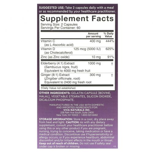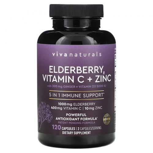 Описание товара Viva Naturals, Elderberry, витамин C и цинк, поддержка иммунитета 5 в 1, 120 капсул